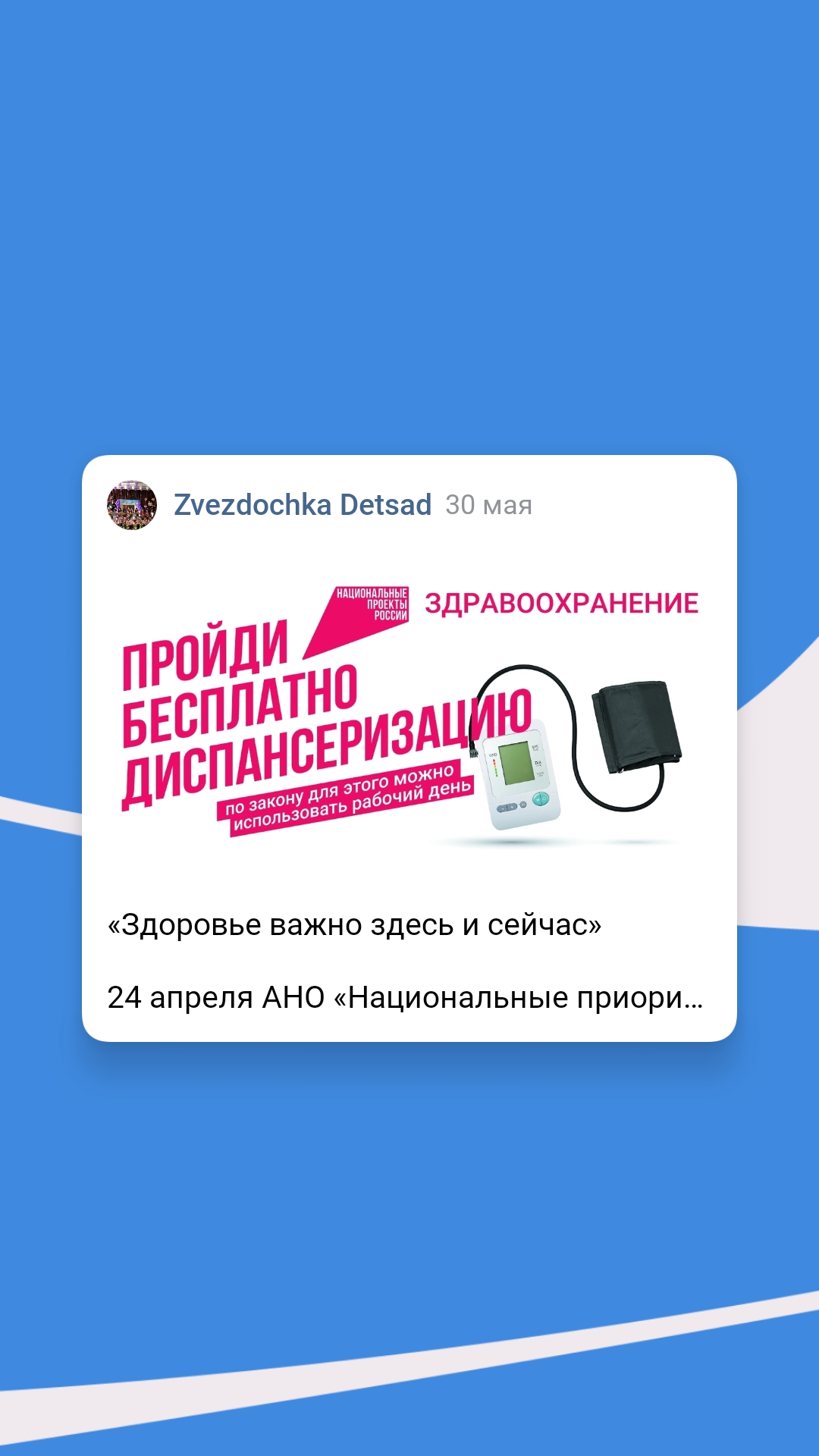 24 апреля АНО «Национальные приоритеты» совместно с Минздравом России запустили коммуникационную кампанию национального проекта «Здравоохранение», направленную на популяризацию диспансеризации.